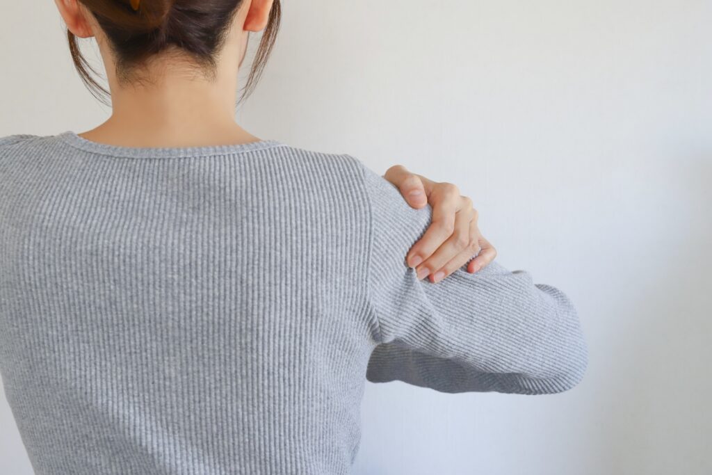 主な症状は、肩関節の痛みと動かしにくさです。腕を上げる、後ろに回す、服の袖に腕を通す、髪を結ぶといった動作がつらくなり、症状が強い場合は、夜間にズキズキと痛み、睡眠を妨げられることもあります。