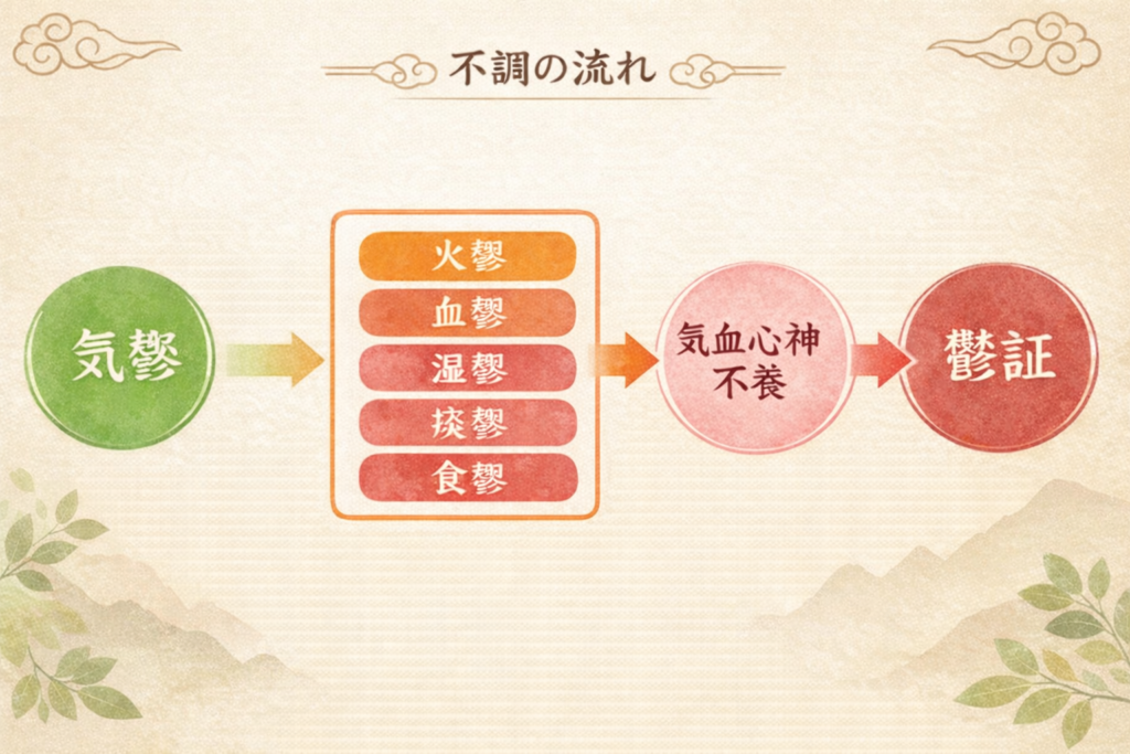 これらの六鬱が、最終的に「心」を養うことができずに「鬱証」へと至るのです。